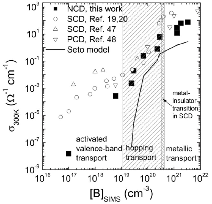 Left: Conductivity of diamond films vs boron concentration for NCD, SCD (single crystal diamond ) and PCD (microcrystalline / polycrystalline diamond). All three types of diamond exhibit similar behaviour except at low boron concentration where the conductivity of NCD drops off due to the small grain size, see Gajewski et al, PRB 79 (2009) 045206