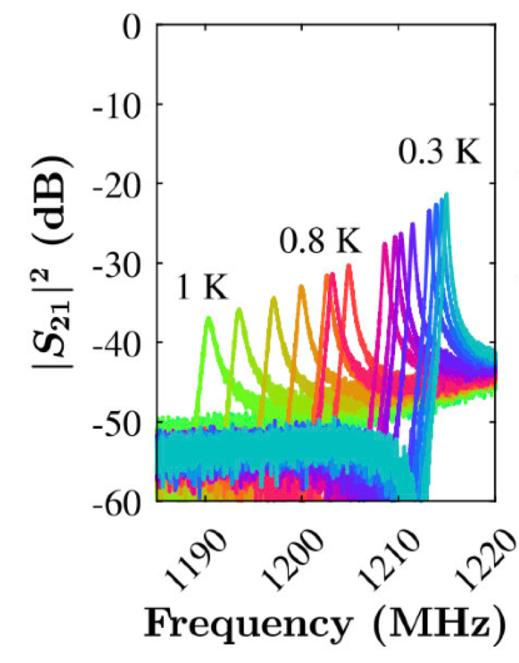 Left: Resonance characteristics of the above coplanar waveguide. The resonant peaks shift as a function of temperature as the concentration of quasi-particles and thus the impedance varies with temperature.