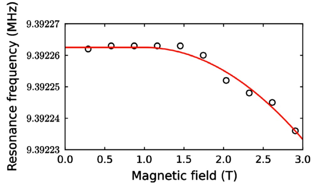 Bottom left: The resonant frequency of the superconducting cantilever as a function of magnetic field. The ability of the device to operate at high magnetic field is surprising and due to the inherent high critical field of boron doped diamond.