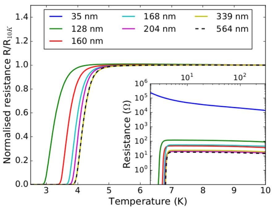 Bottom right: recent optimised NCD films showing higher transition temperatures and superconductivity even in very thin films (the 35nm film is superconductivity at much lower temperatures), see Klemencic et al, PRM 1 (2017) 044801
