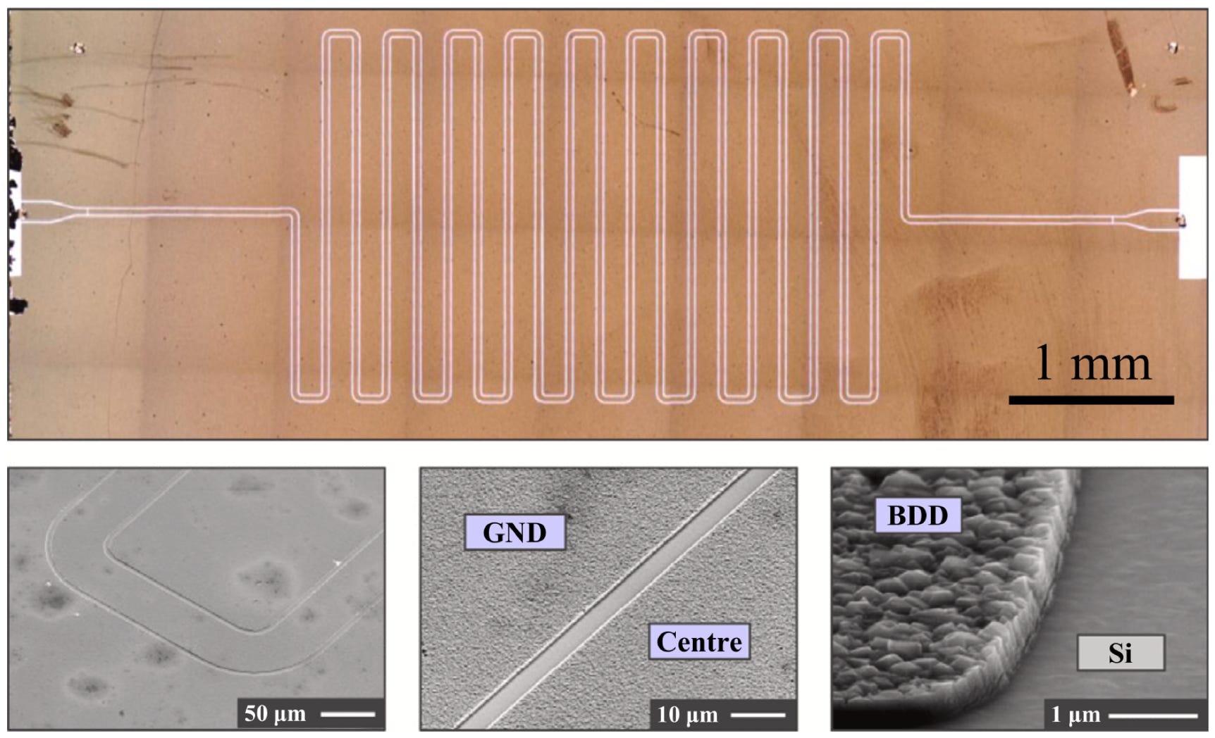 Above left to right: Scanning Electron Micrographs of increasing magnification of the coplanar resonator. The smooth areas represent where the NCD has been etched though to the substrate.