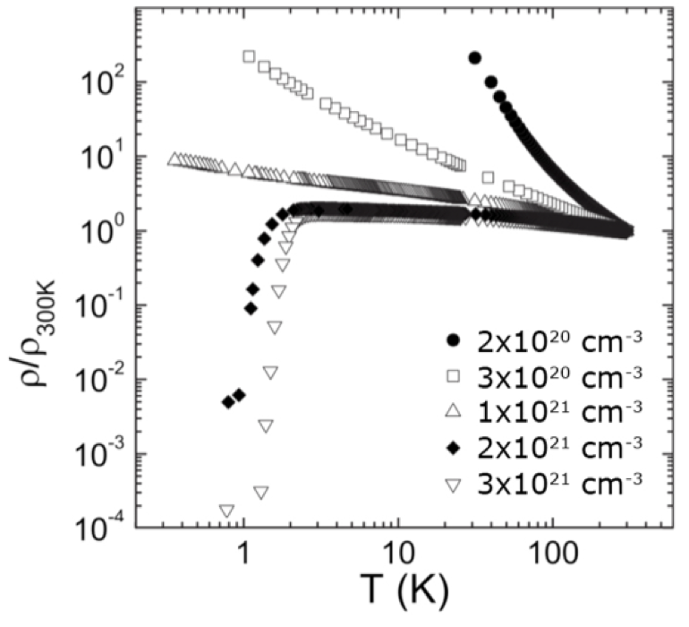 Bottom left: Low temperature conductivity as a function of boron concentration, above a critical concentration (the Metal - Insulator Transition), these films exhibit superconductivity, see Achatz et al, PRB 79 (2009) 201203