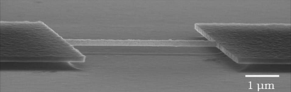 Top Left: Superconducting nano cantilever fabricated from boron doped NCD. The device was fabricated by growing boron doped NCD on silicon with a 500nm SiO2 interlayer. After ebeam pattering a reactive ion etching, the device is released by sacrificially etching the SiO2 with HF vapour.
