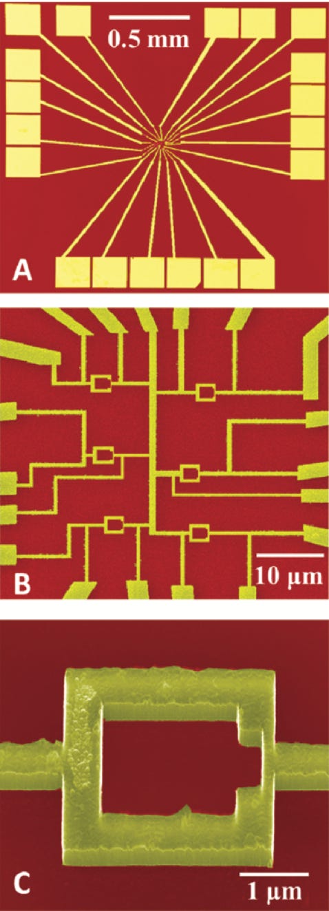Middle left: Higher magnification of the above showing multiple SQUIDs with different size junctions. Each SQUID has multiple contacts for redundancy.