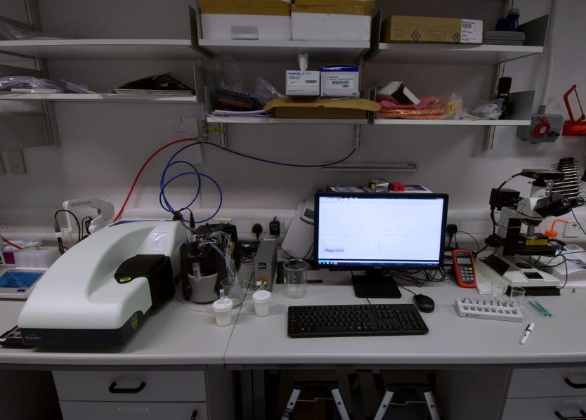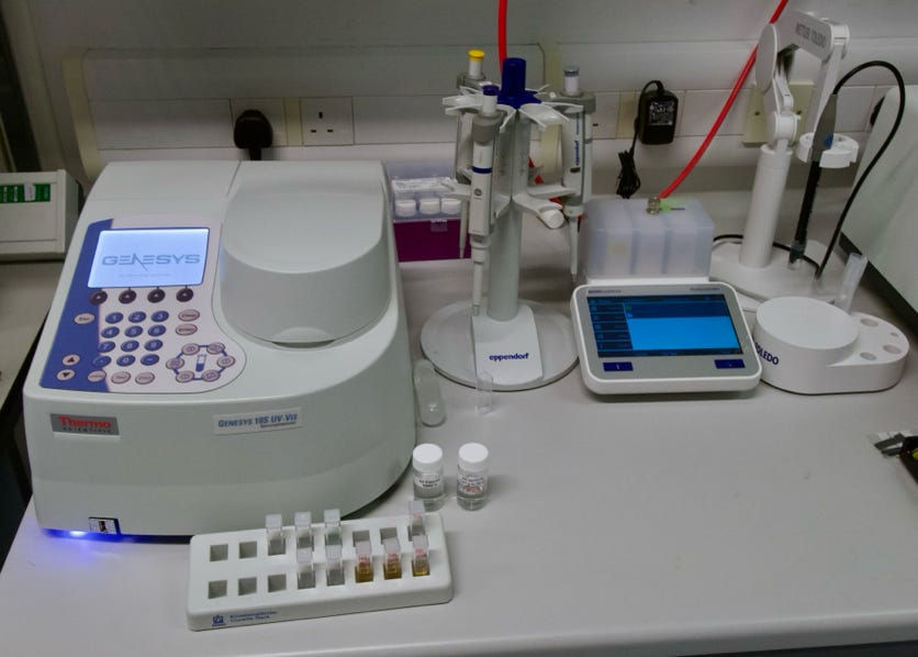 Left to right: Genesys 10s uv-vis spectrometer and Mettler Teledo SevenMulti pH and conductivity meter; Malvern Zetasizer Nano ZS with autotitrator (Dynamic Light Scattering apparatus; Nanosight LM10 for Nanoparticle Tracking Analysis.