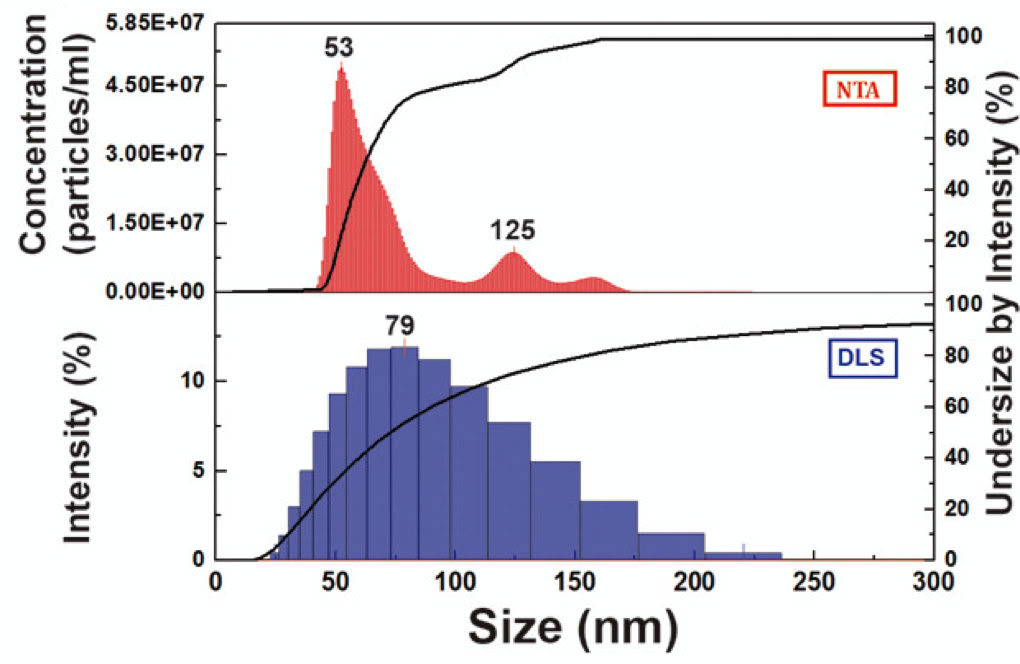 Left: Comparison of Nanoparticle Tracking Analysis (NTA, red) with Dynamic Light Scattering (DLS, blue) of the same sample. NTA is able to distinguish different size distributions within the solution whereas DLS can only see an overall distribution. This is because DLS distributions are skewed by the largest particle size, with particles ten times the size scattering million times more light. NTA tracks individual particles within the solution rather than overall scatter from a solution, see Gines et al, ACS Omega,3 (2018) 16099.