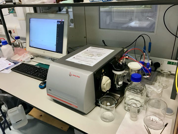 Right: Anton Parr SurPASS 3 electrokinetic analyser. The SurPASS measures surface zeta potential via the streaming potential / current method as a function of pH etc. This allows us to characterise the interface between solutes and solid surfaces, predicting electrostatic attraction or repulsion between particles and surfaces. We have used this to improve nucleation of diamond on various materials such as GaN, AlN, SiN, LiNbO3 etc: