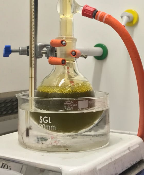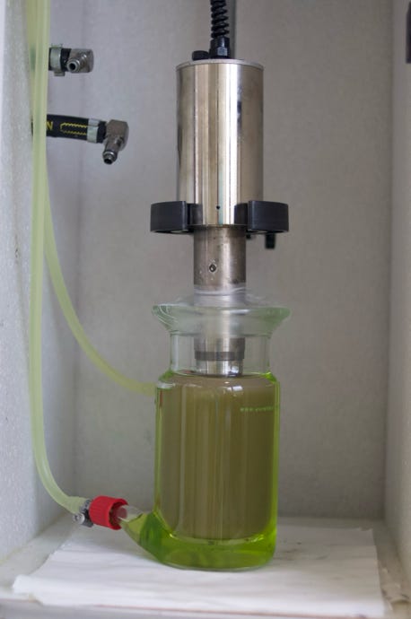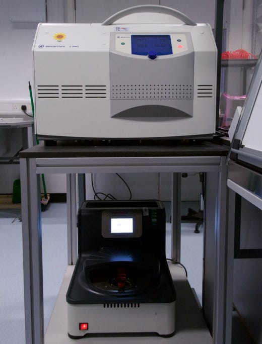 Left to right: Water cooled high power ultrasonic treatment of nanoparticle colloids; acid reflux (HNO3 in this case) of nanoparticles; 60 KG RCF centrifuge (top) and Pulverisette 7 Premium Line high energy planetary mill (bottom).